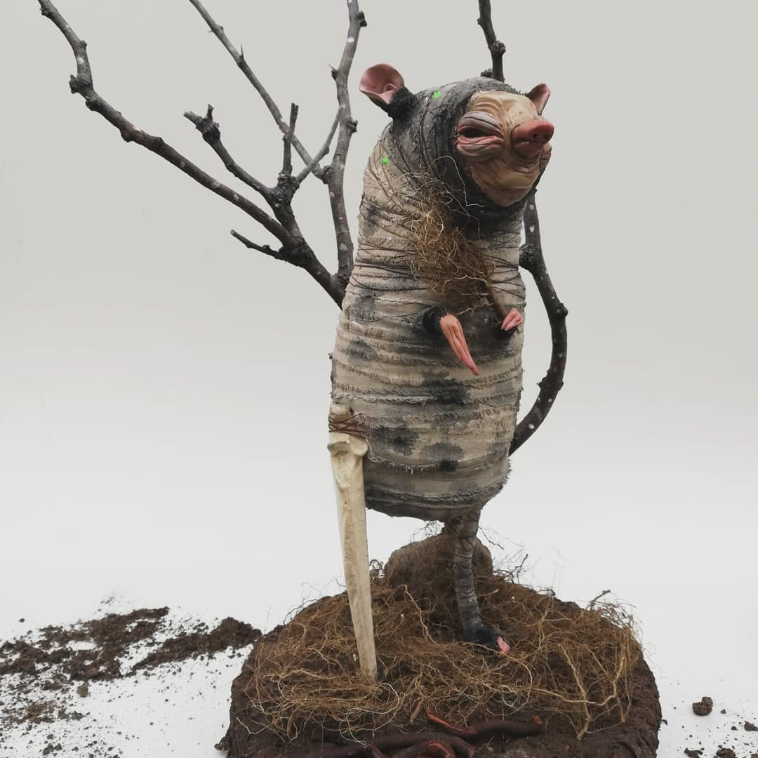Epoxy, glass, clay paste, bone, branches, roots, porcelain, resin, canvas, acrylic and watercolor